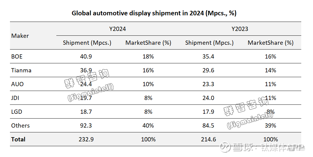 通常情况下,在新兴显示的初期,都是日韩占据着主导权,比如电视、手机等。而在车载显示市场演变的过程中,这一状况被改写,中国面板厂商依托其在全球显示产业中的领军位置。群智咨询(Sigmaintell)发布的最新统计数据显示,中国大陆面板厂商车载显示面板出货占全球市场份额的51.7%,首超半数,不断打破原有市场竞争态势,成为推动行业发展的重要力量。其中,京东方在2024年出货量达到4090万片,市场份额为17.6%,位居第一。