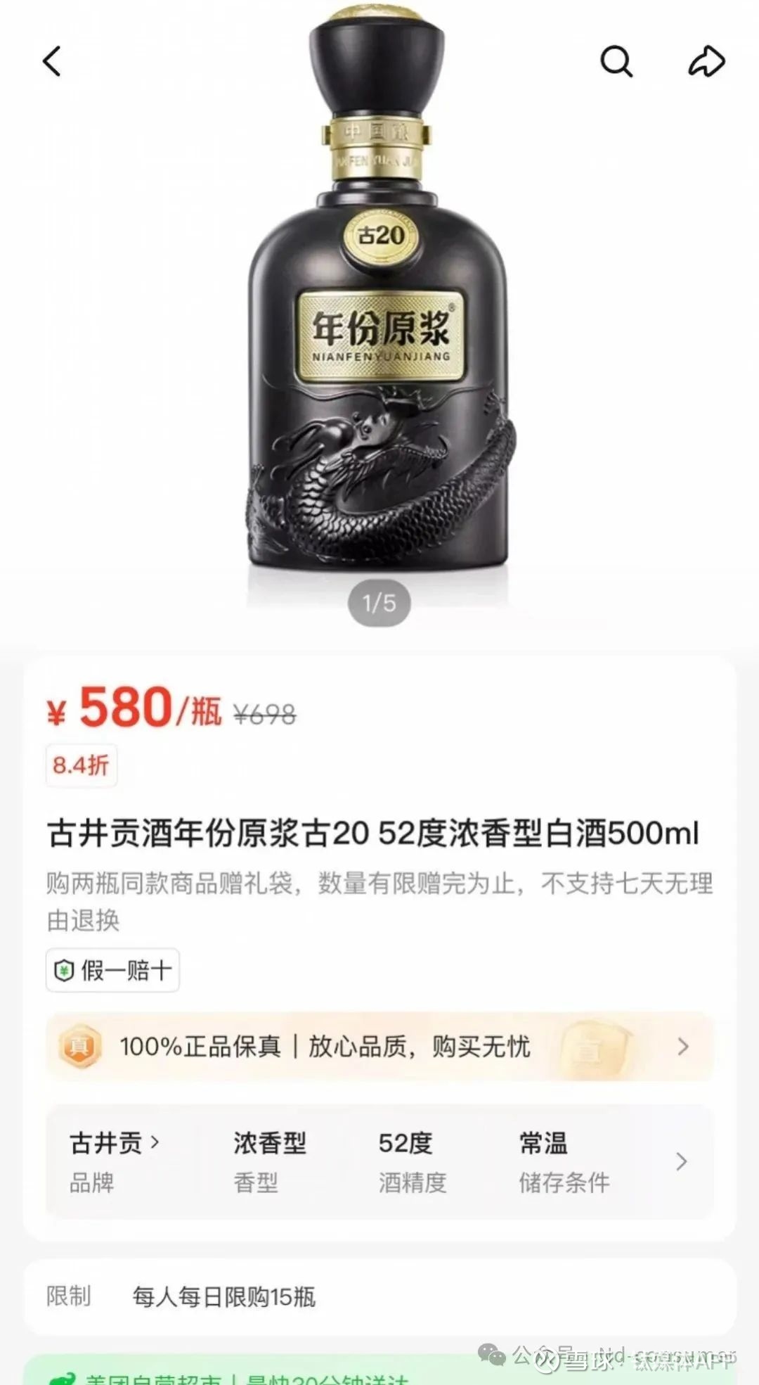 根据南都湾财社-酒水新消费指数课题组发布的最新一期《湾区酒价》,古20在湾区整体的市场零售均价约601元,但不少渠道的售价已经跌破600元,比如在小象超市上,广州区域的售价为580元;在美团名酒行上,深圳地区的售价为545元。