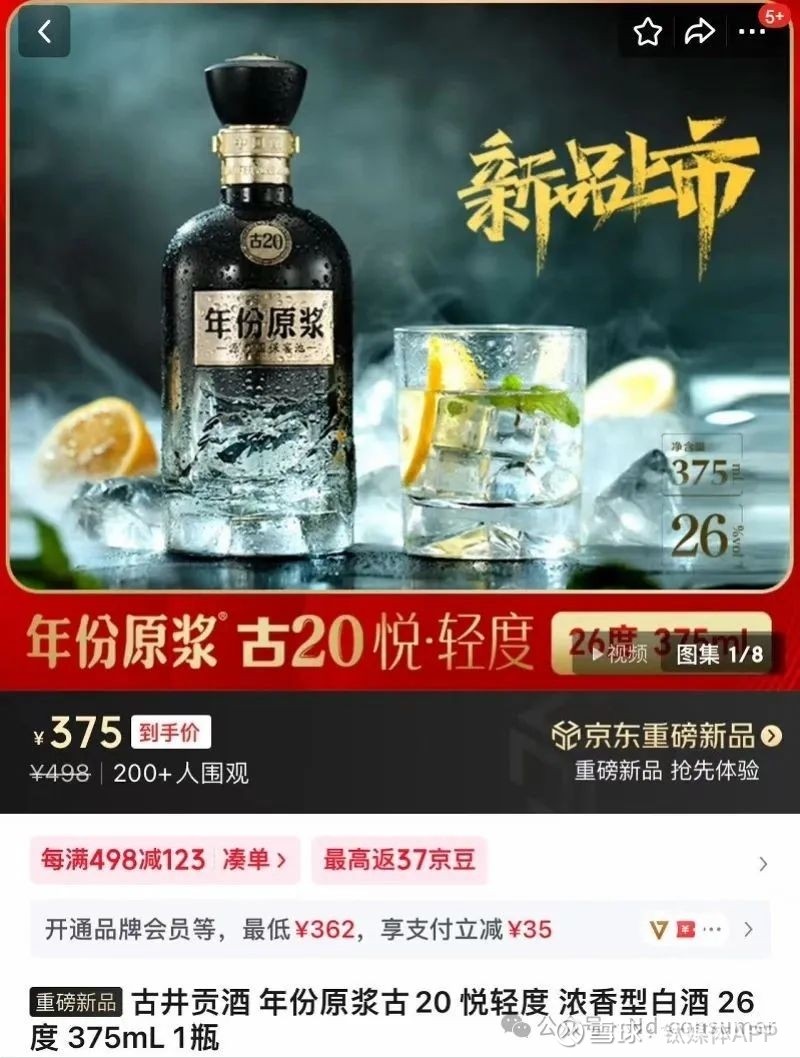 而本次推出的新品相比52度产品的酒精度直接砍半,为26度。南都湾财社记者从古井贡酒电商平台官方旗舰店上看到,目前这款产品已经上架,375ml规格售价375元,折合约500元500ml,也就意味着其与高度产品的价格差距最低不足百元,由此引发业内关于其价格接受度的讨论。