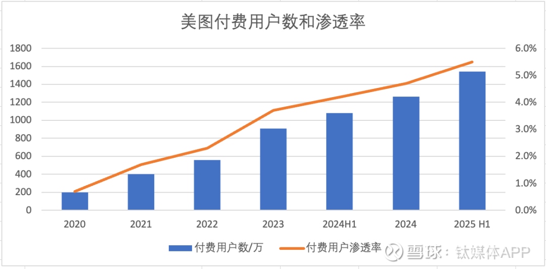 相比 MAU 相对稳健的增长,美图在付费用户数和付费渗透率方面的增长就快很多了。2025 年上半年,美图付费用户数 1540 万,增长 42%,付费渗透率 5.5%。此前美图 CEO 吴欣鸿曾表示,美图最初制定的付费渗透率目标是 5%,现在看来是有些保守了。