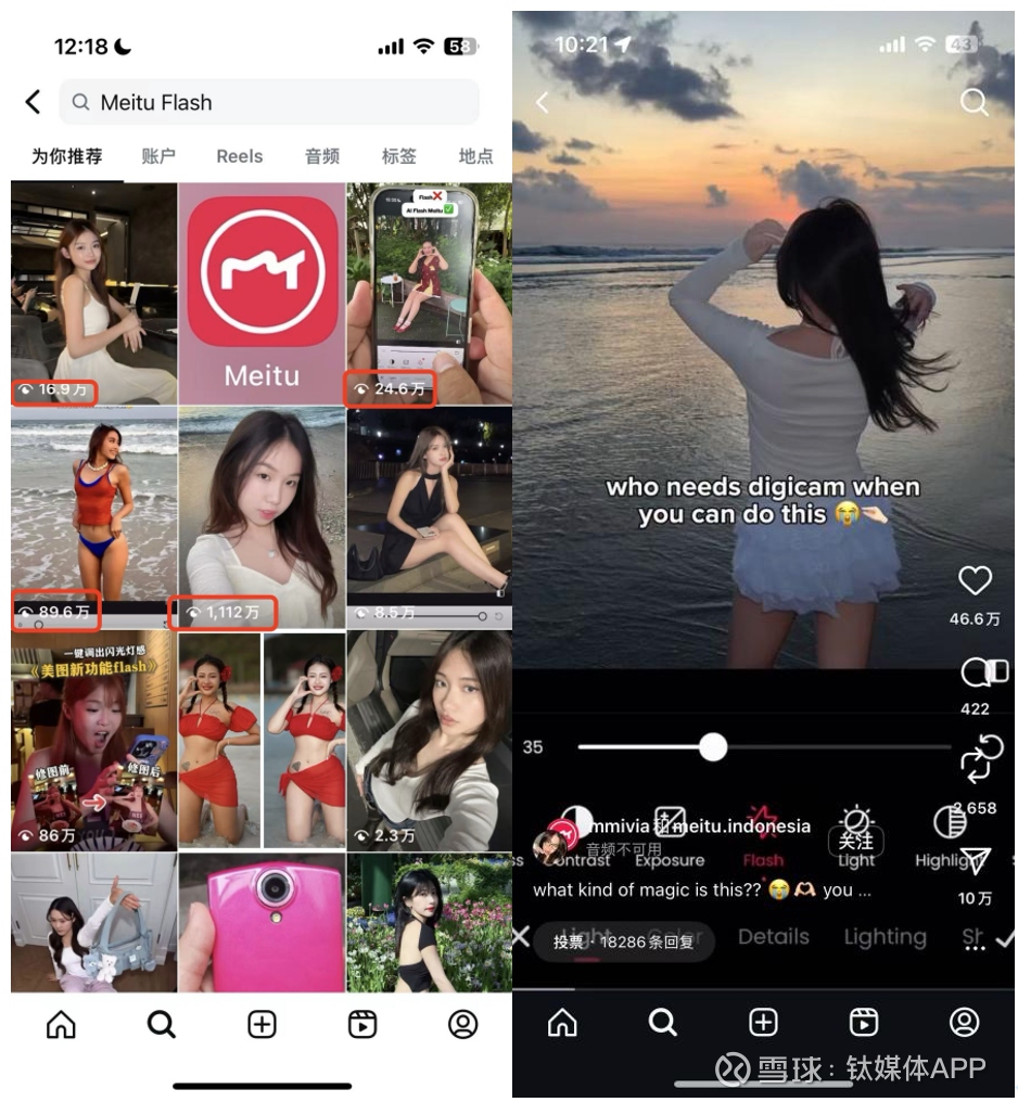 功能够刚需、效果也不错,“AI 闪光灯”开始在社媒上传播,当官方捕捉到社媒风潮后,开始通过KOL进行增长,主要目标市场是印尼,比如,右图这位名为“mmivia”的印尼网红,她在 TikTok 和 Instagram 上发布的内容,观看量均超过了 1000 万。