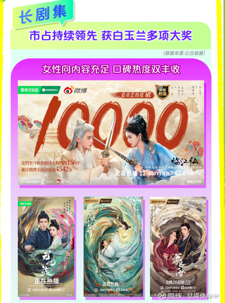 具体来看,深耕“长剧”多年,爱奇艺在这一核心赛道持续领先。Q2至暑期档,爱奇艺剧集总市占率连续四个季度领跑行业。《临江仙》《朝雪录》《无忧渡》《书卷一梦》等多部剧集口碑热度双收。