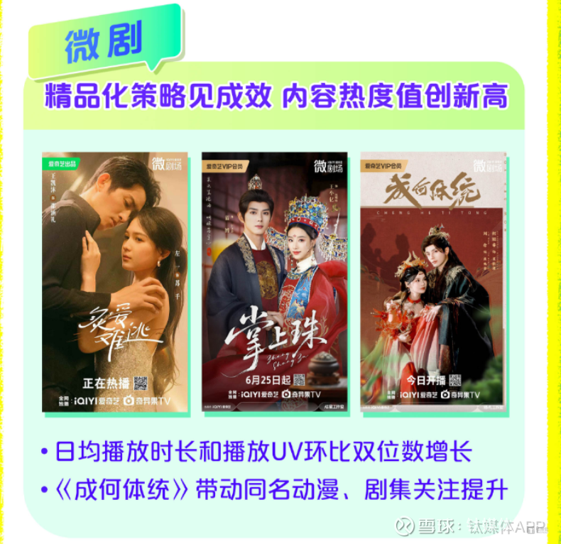 爱奇艺Q2短剧业务的表现验证了上述内容方法论的成功复用。财报数据显示,Q2爱奇艺微剧日均播放时长、UV双位数增长。首部自制微剧《成何体统》大获成功,带动同名动漫复看量提升3倍,长剧、动漫第二季预约同步激增。