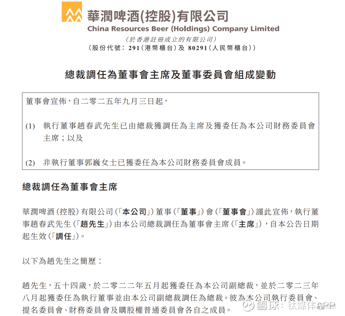昨日,华润啤酒发布公告,自2025年9月3日起,执行董事赵春武已由总裁调任为主席及获委任为公司财务委员会主席;非执行董事郭巍已获委任为公司财务委员会成员。