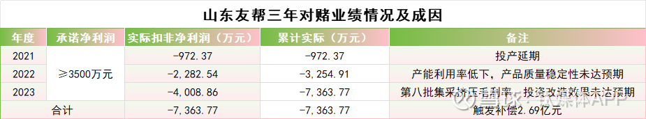2021-2023年间,山东友帮实际累计亏损高达7363.77万元,未能完成业绩承诺目标,直接触发《股权转让协议》中的业绩补偿条款。