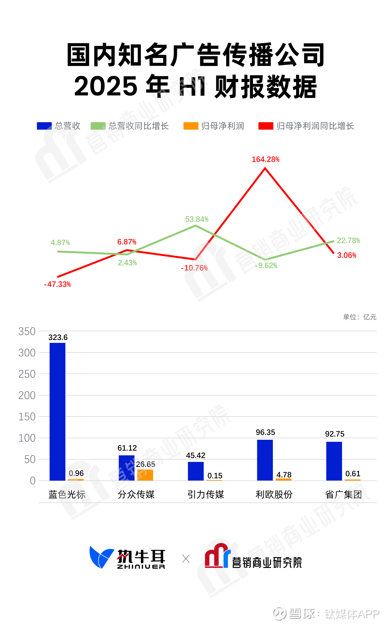 国内知名广告传播公司蓝色光标、分众传媒、引力传媒、利欧股份、省广集团近期均发布了2025年的半年报。