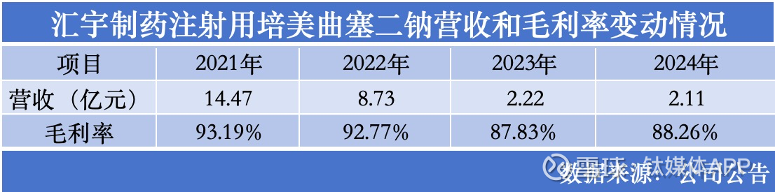 观察君梳理发现,2021年达到顶峰后,汇宇制药注射用培美曲塞二钠的营收快速锐减,已经从2021年的14.47亿元降至2024年的2.11亿元;毛利率也从93.19%降至去年的88.26%。
