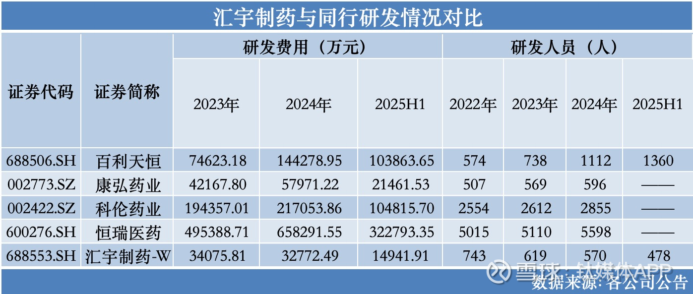 类比四川本地的药企和同行来看,百利天恒、康弘药业、科伦药业、恒瑞药业最近两年的研发费用均在递增,研发人员数量也呈增加状态。比如:2023年、2024年、2025H1,同属四川的百利天恒研发费用分别为7.46亿元、14.43亿元、10.39亿元,研发人员738人、1112人和1360人。