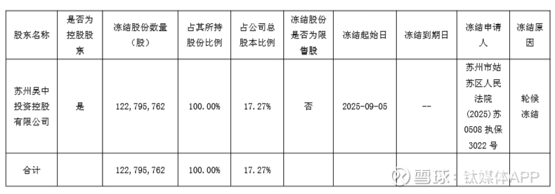 吴中投资持有公司1.23亿股无限售流通股,占总股本17.27%,这部分股权如今全部处于“质押+司法标记+司法冻结+轮候冻结”的四重锁定状态,无任何可自由处置的股份。