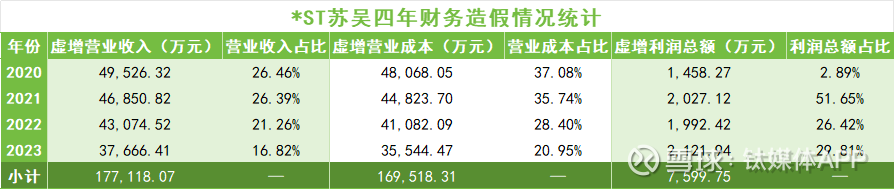 与资金占用相伴而生的是虚构贸易。2020-2023年,*ST苏吴通过旗下多家贸易子公司,虚构了近18亿元的营业收入。这四年间,虚增的营收分别占当期披露总额的26.46%、26.39%、21.26%和16.82%,其中,2021年过半账面利润为虚构。
