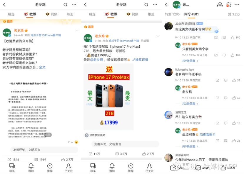 以同行老乡鸡为例,其在微博置顶的两条内容,一条是24年4月的公开信,回应了消费者对“预制菜”的相关质疑,并标明了哪些是餐厅现做、半预制、复热预制的菜品明细以及供应商信息,态度和诚意都无可挑剔;另一条则是25年9月10日最新发起的品牌有奖互动福利,网友想要什么,老乡鸡就紧跟什么;而在日常,高频输出的趣味内容和“网感”表达,以及在评论区的话题互撩,都让老乡鸡的品牌形象变得立体而鲜活。它不是一个被仰视的品牌,而是和消费者玩在一起的“饭友”(有钱还喜欢“撒币”的那种,谁会不喜欢?)。