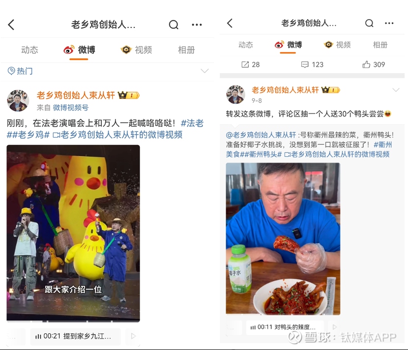 除此之外,老乡鸡董事长束从轩更是在微博上彻底放飞自我,一会儿挑战衢州辣鸭头还评论区抽奖粉丝送30个,一会儿又在法老演唱会上和上万人一起喊咯咯哒。高管矩阵和官方账号的高频互动,表面上看娱乐了大众、树立了人设,实际上是借此实现了与公众的有效沟通。