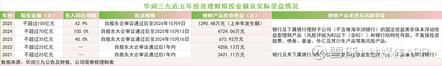 笔者梳理华润三九近5年理财产品拟投金额及年收益发现,自2022年以来,公司用于理财投资的额度从25亿元增至2025年的100亿元。