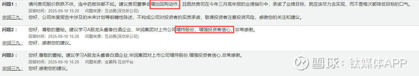 暂未响应回购预期此次公告发布前,就有投资者在互动平台上多次建议华润三九“增持股份”;公告披露后,亦有多位投资者在社交平台表达对这笔资金用于回购增持、分红的期许。