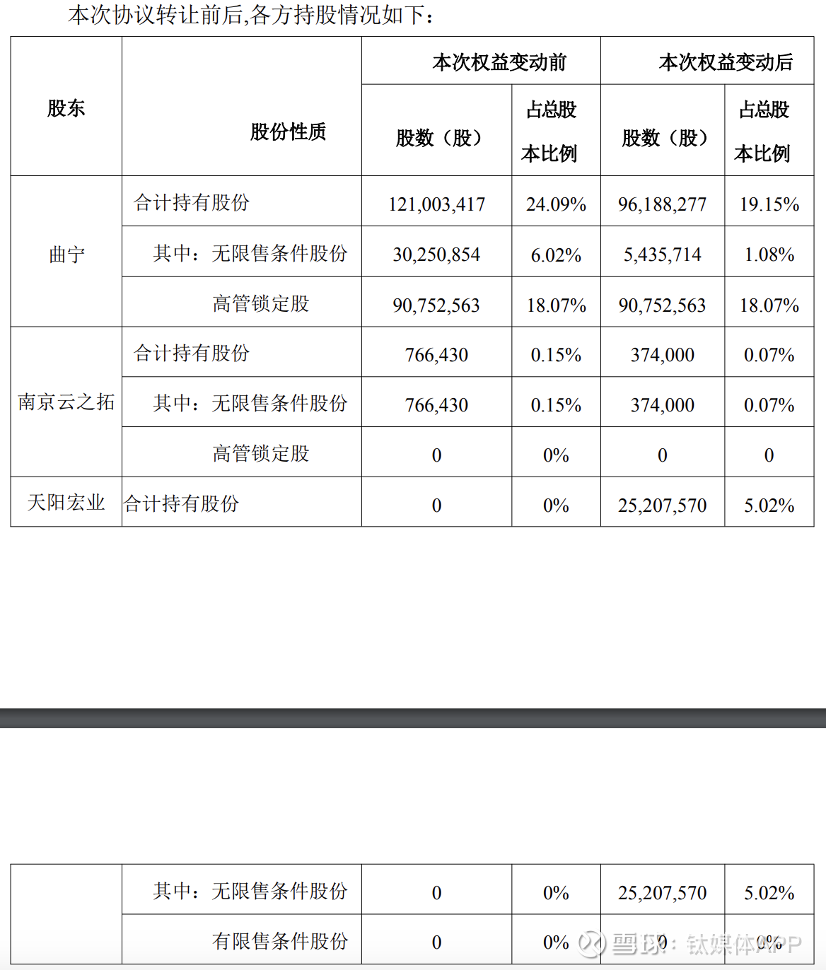 两度清仓赚超1.6亿,变身成战投根据公告,首都在线实控人曲宁和股东南京云之拓创业投资合伙企业(有限合伙)拟向天阳科技合计转让5.02%的股份,转让价格(17.6元/股)较昨日收盘价约打8折,总价4.43亿元。