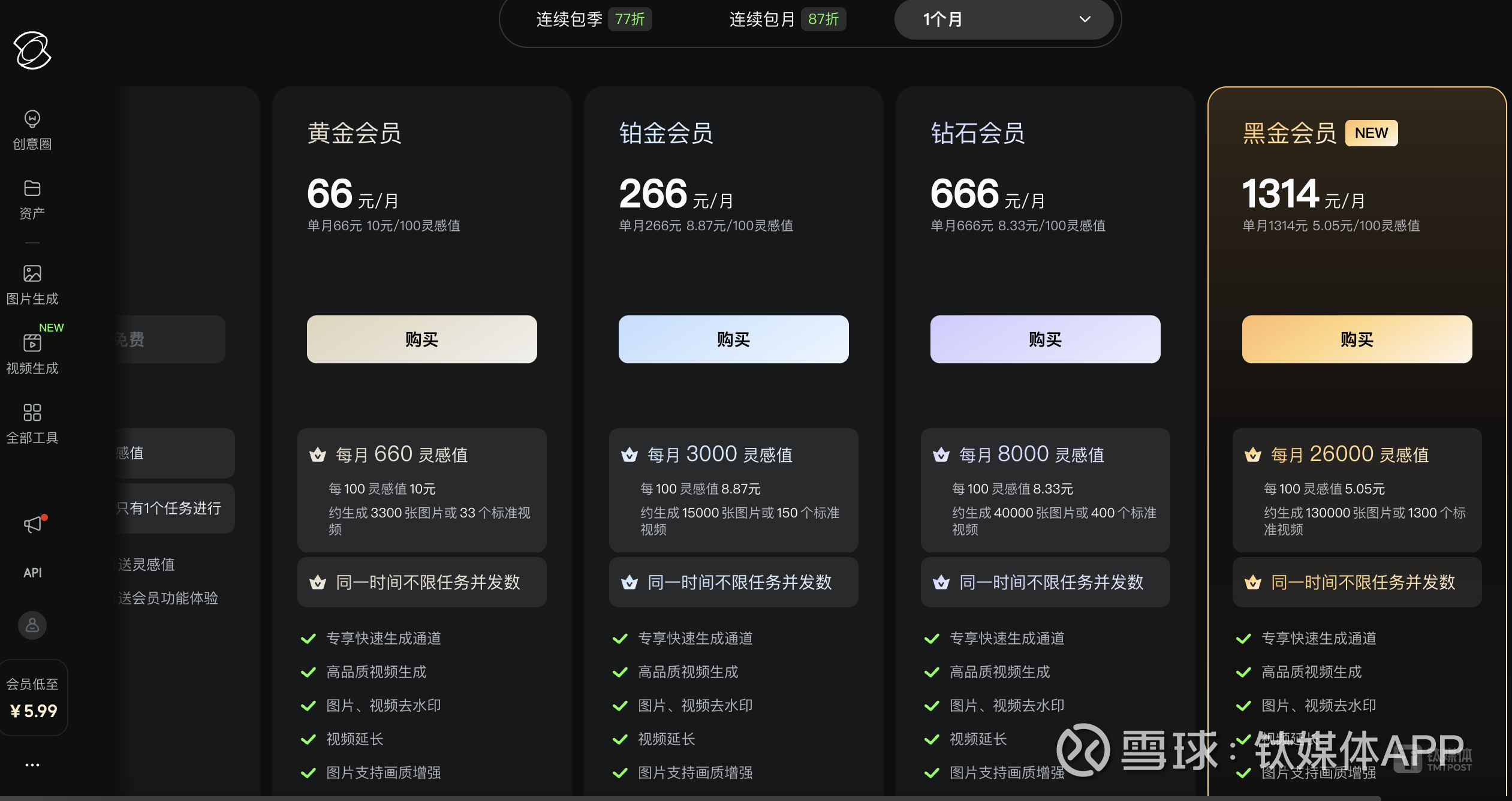 可灵AI的收费标准,黄金会员66元/月,铂金会员266元/月,钻石会员666元/月,黑金会员1314元/月。