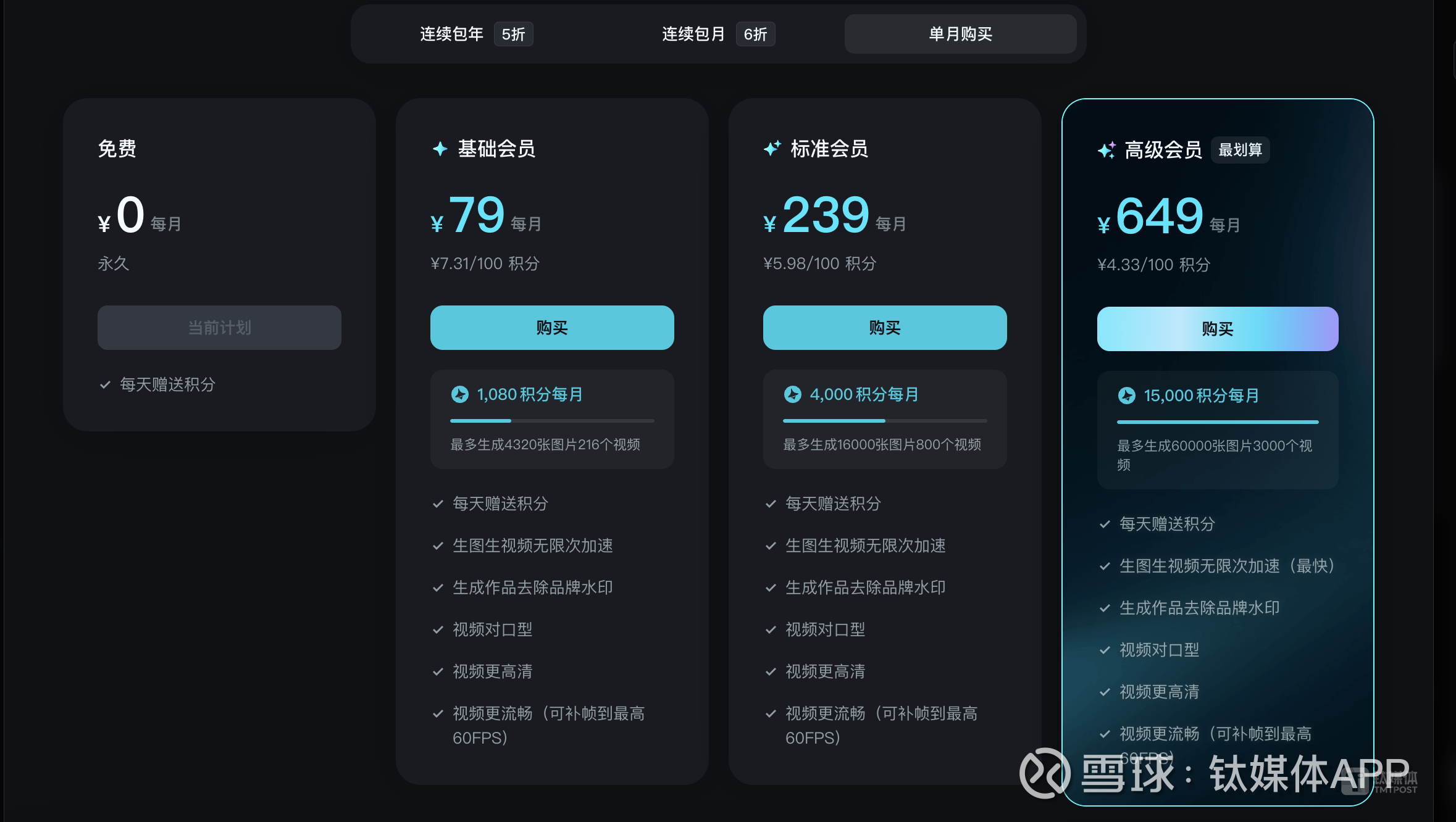 即梦AI收费整体相对较便宜,定价分为三档,基础会员、标准会员、高级会员的月费分别是79元、239元、649元。