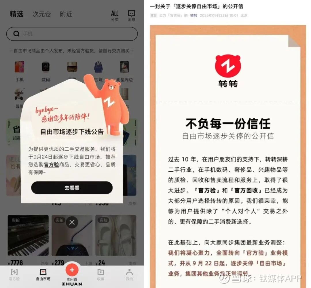 但这种常年“保二争一”的尴尬处境,让转转追赶闲鱼无望,也保不住利润。为此,转转逐渐从C2C(用户间交易,闲鱼主要是这种模式)转型C2B2C(在用户间多了个中间商),并在昨日发布公告,宣布将关停旗下C2C模式的“自由市场”业务,9月24日开始关闭商品发布入口,10月31日正式关闭所有业务,100%投入C2B2C模式的二手“官方验”业务。