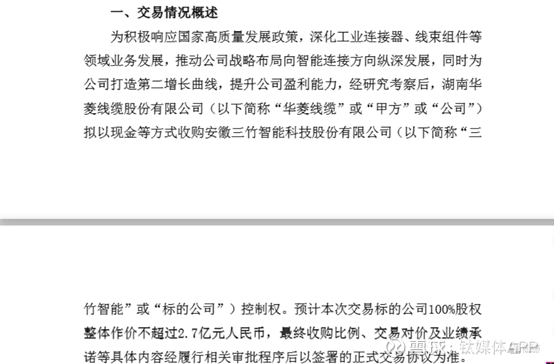 9月23日晚,老牌缆企华菱线缆(001208.SZ)公告,拟以现金等方式收购安徽三竹智能科技股份有限公司(以下简称“三竹智能”)控制权,关于三竹智能100%股权整体作价预计不超过2.7亿元。