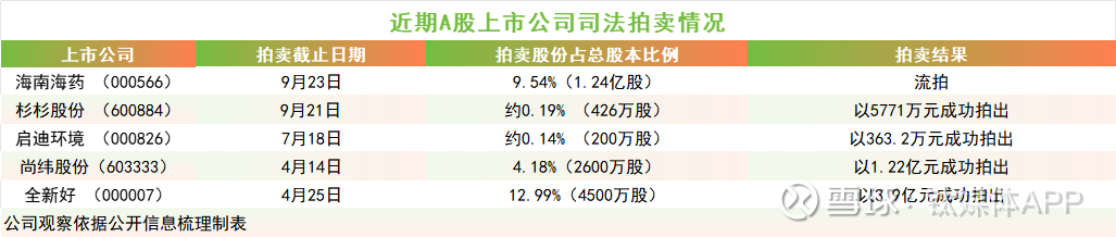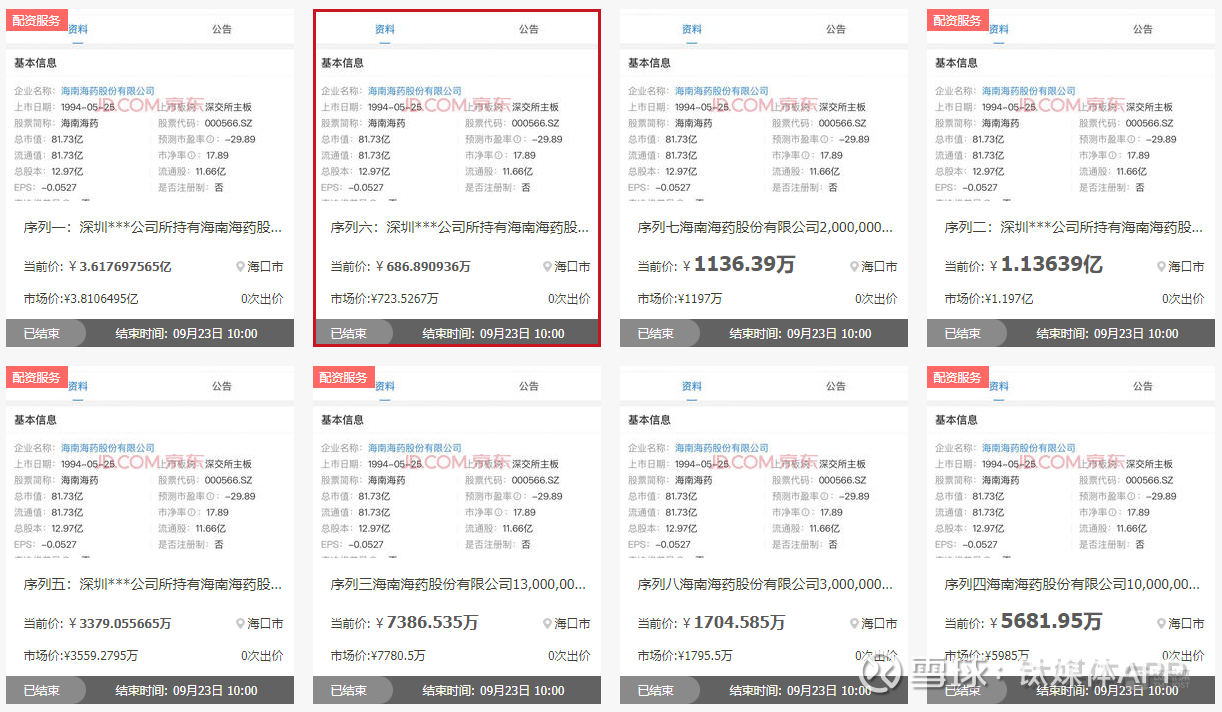 海南海药9月23日公告,公司第二大股东南方同正所持已质押的1.24亿股股票,于9月22日~23日在京东司法拍卖平台进行拍卖,但因无人出价,拍卖未能成功。拍卖股份占南方同正所持股份的92.86%,占总股本的9.54%。