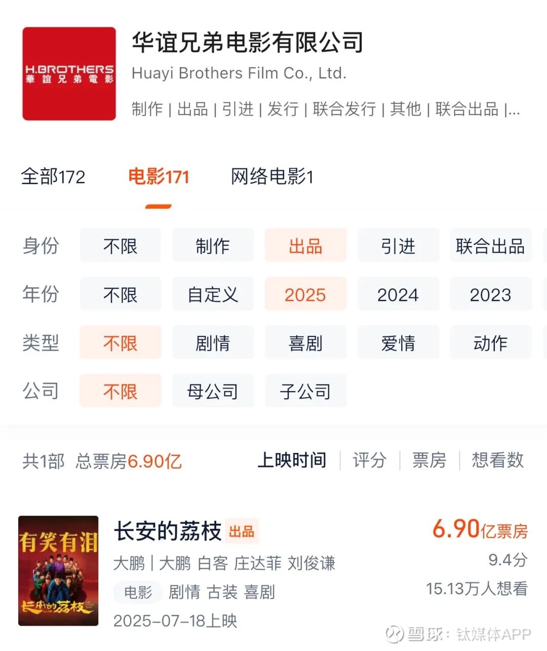 2025年以来,华谊兄弟只有一部主投电影《长安的荔枝》上映,同时《志愿军3》、《美人鱼2》均已进入后期制作阶段。