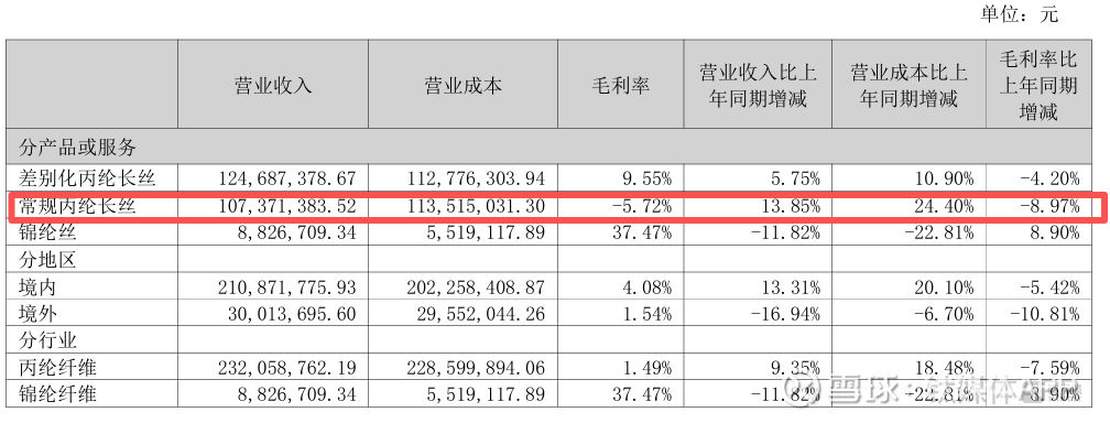 从主营业务产品的表现来看,不同产品线之间存在明显分化。上半年差别化丙纶长丝实现收入1.25亿元,毛利率为9.55%,成为公司目前唯一仍保持盈利的产品线;而常规丙纶长丝虽然实现收入1.07亿元,但毛利率却为-5.72%,显示该业务已经陷入“越卖越亏”的困境。