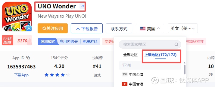 就在9月17日,美泰163正式在全球170多个国家及地区上线了第二款UNO游戏——《UNO Wonder》,当天便登上35个区域市场iOS游戏免费榜TOP20(其中位于美国第2、德国第6、丹麦第7),预计可能成为新的长线爆款。