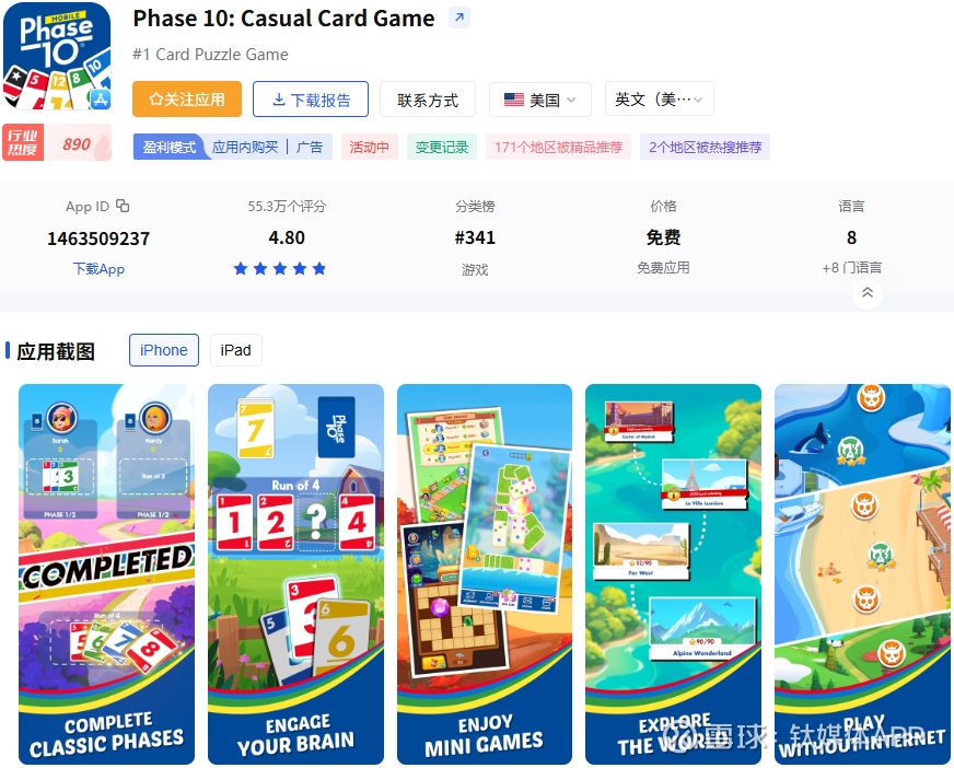 先是2019年10月上线的《Phase 10: Casual Card Game》,其原型源于经典的纸牌游戏“Phase 10”,玩法相对重度,单局长度在10分钟左右(上线初期单局时长为45分钟至1小时,后做了碎片化处理)。