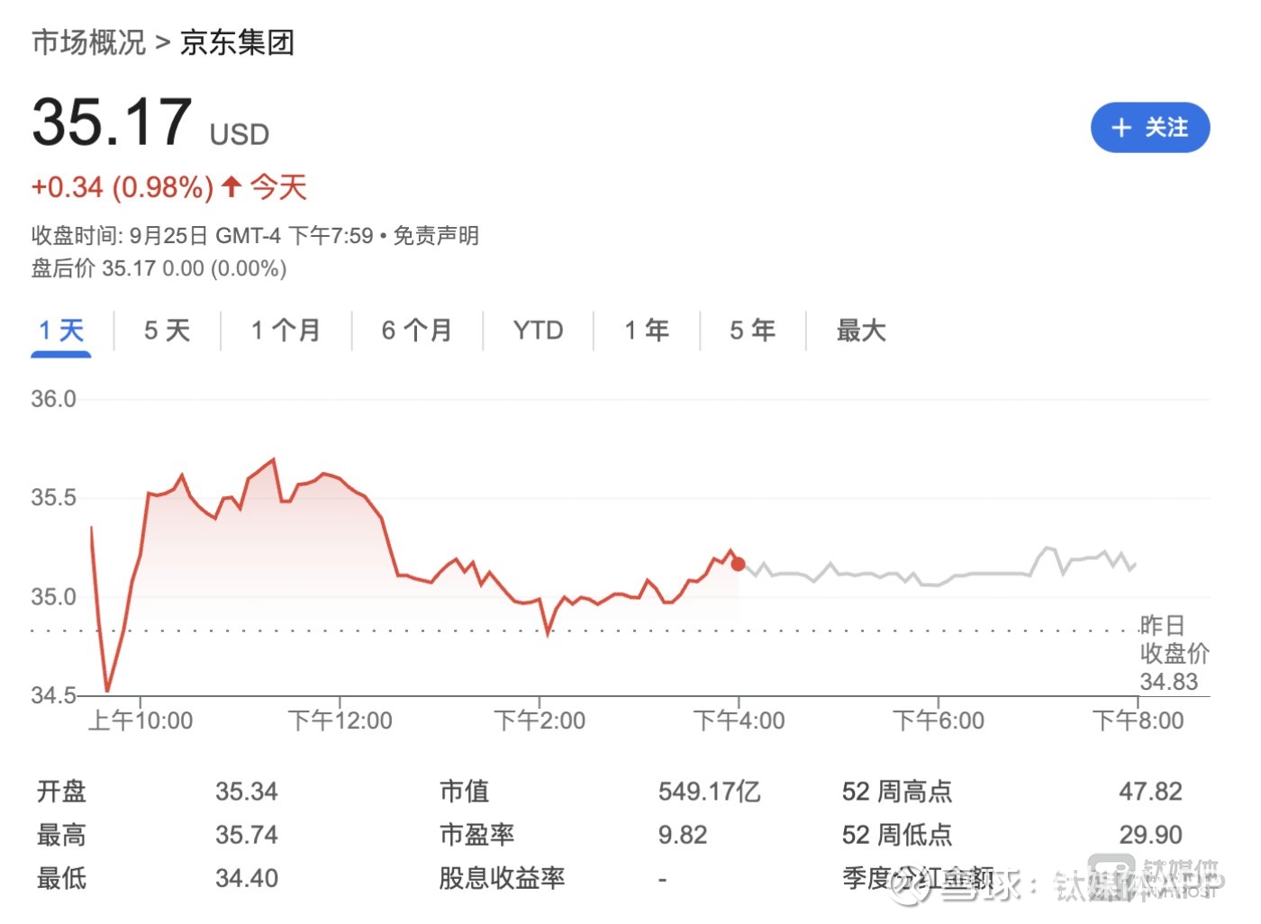 截至9月25日收盘,京东港股(09618.HK)上涨3.46%;今晨京东美股(NASDAQ:JD)收涨0.98%,总市值549.17亿美元。