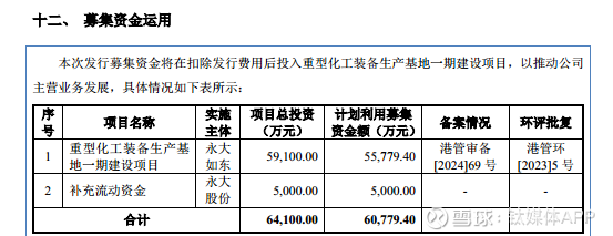 募投项目合理性存疑永大股份此次IPO欲募集60779.4万元,分别用于重型化工装备生产基地一期建设项目、补充流动资金项目,具体情况如下: