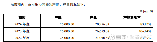 另外,从实际经营情况来看,公司当前产能利用效率已出现明显下滑,扩产计划缺乏充足的市场需求支撑。报告期内,公司压力容器产量呈现“先升后降”的波动趋势:2022年为21096.39吨,2023年增至26659.08吨,2024年却大幅回落至20956.89吨,同比减少5702.19吨;对应产能利用率也同步下滑,2024年在产能未变的情况下,利用率降至83.83%,较2023年下降22.81个百分点。这一数据表明,公司现有产能尚未实现充分饱和,2024年产量与利用率的双降,更反映出压力容器市场需求可能出现阶段性收缩,或公司自身订单获取能力减弱。在此背景下,公司仍计划新增3万吨产能,这不仅令人疑惑,在公司目前产能尚未充分利用的背景以及公司自身降产的情况下,为何还要大举扩产?以及如此多的产能到底是否能被市场消化?