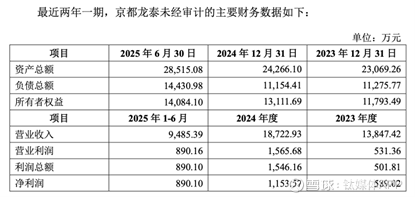 根据预案,2023年、2024年、2025H1,京都龙泰分别实现营收1.38亿元、1.87亿元、9485.39万元,净利润589.02万元、1153.57万元、890.10万元,有增长趋势。