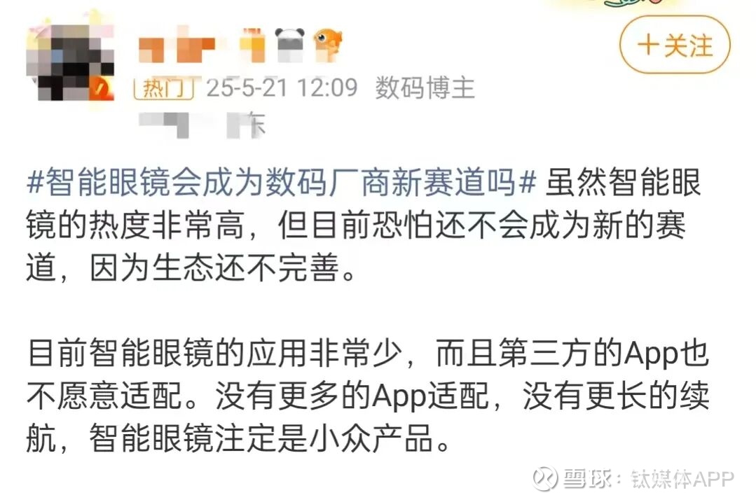 有大V博主直言,虽然AR眼镜的热度非常高,但目前恐怕还不会成为新的赛道,因为生态还不完善,“没有更多的APP适配,没有更长的续航,智能眼镜注定是小众产品”。