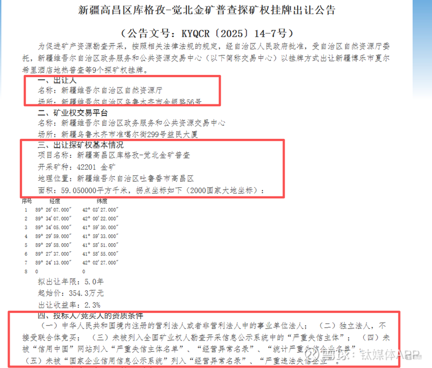 5.1亿元竞得觉北金矿普查探矿权8月13日,新疆政务服务和公共资源交易中心发布了《2025年新疆博乐市夏尔希里酒店地热普查等9个探矿权挂牌出让公告》,四川黄金在9月30日以5.1亿元竞得其普查探矿权。
