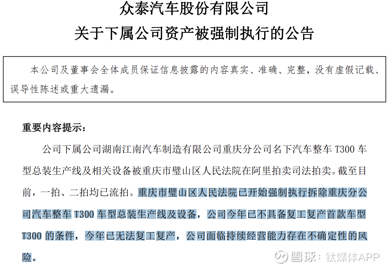 因始终未就债务问题达成一致,众泰汽车重庆基地的整车总装生产线及相关设备被强制执行,今年8月以来,法院对此进行的两轮拍卖均流拍,最终在今年9月,众泰汽车被寄予复产众望的重庆基地生产线遭到强制拆除。
