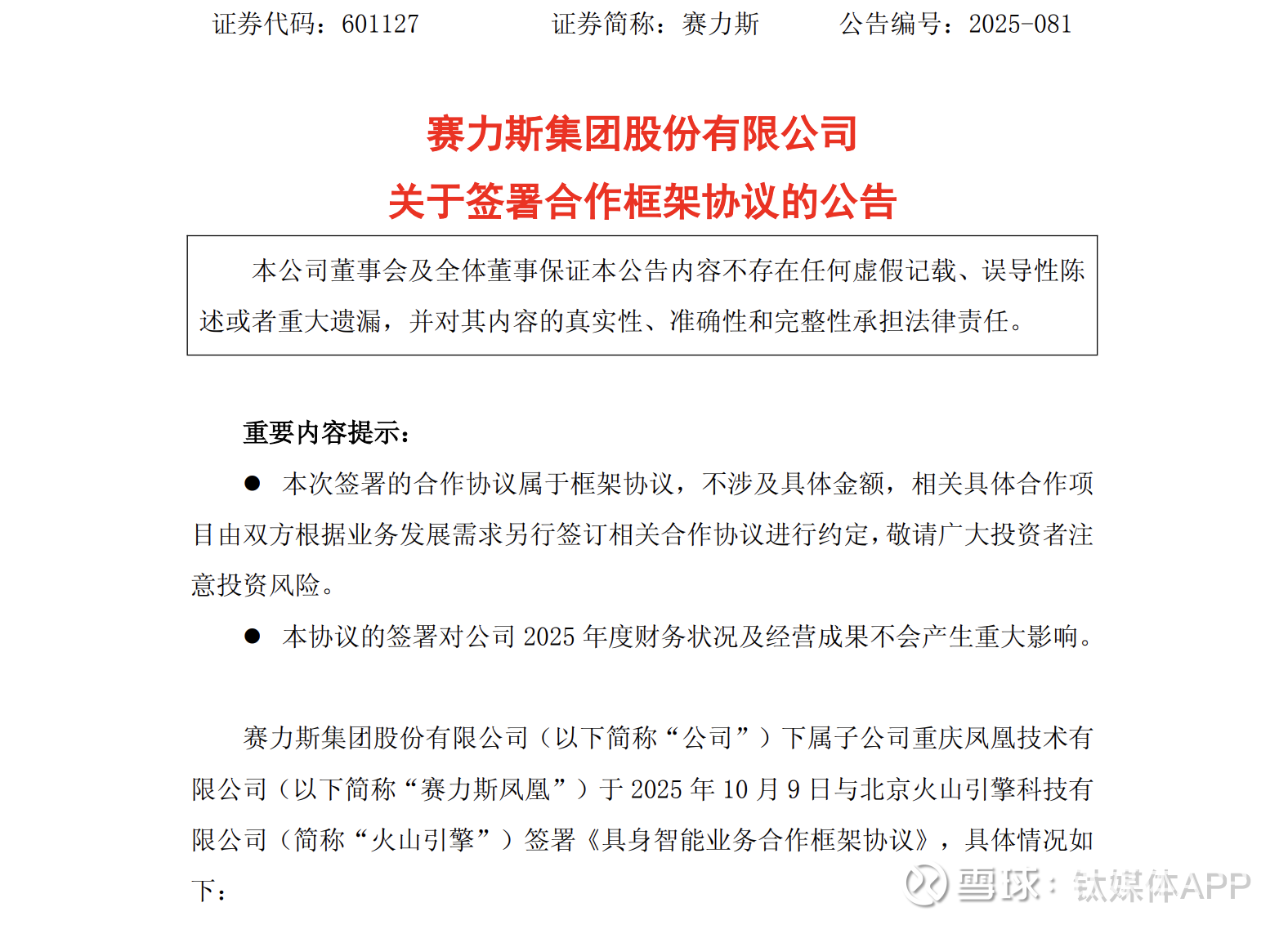 10月10日消息,近期刚宣布投资115亿元入股华为汽车智能平台的赛力斯(601127.SH)发布公告称,赛力斯集团股份有限公司下属子公司重庆凤凰技术有限公司(以下简称“赛力斯凤凰”) 与北京火山引擎科技有限公司(简称“火山引擎”)签署《具身智能业务合作框架协议》。