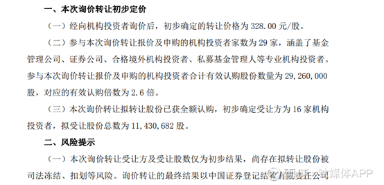 10月9日询价申购情况显示,经向机构投资者询价后,初步确定的本次询价转让价格为328.00元/股,远超前20个交易日股票交易均价的70%。以此估算,高光荣本次拟转让股份的价格约为37.49亿元。