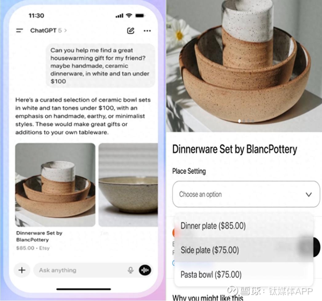 Open AI(ChatGPT的母公司)演示了整个购物过程。用户向ChatGPT提出购物需求:“朋友乔迁,帮忙选一份礼物。手工制作的、陶瓷材质的餐具就不错,最好是白棕配色,预算在100 美元以内。 ”ChatGPT经过一番搜索、筛选、匹配之后,给用户推荐了一件陶瓷餐具套装,该产品来自于手工艺品电商平台Etsy。