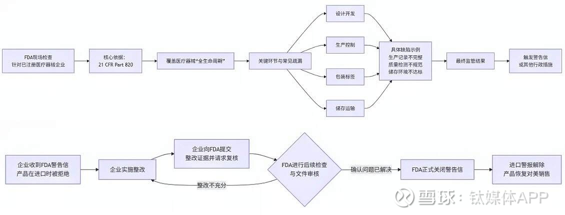 21 CFR Part 820作为核查的根本依据,是多数医疗器械在美国上市之前必须遵守、上市之后随时可能抽查的基本要求,涵盖了从产品设计开发、生产过程控制、包装标签管理到储存运输的全链条。任何一个环节的疏漏,诸如生产记录不完整、质量检测流程不规范、储存环境不达标等,都可能触发警告信。