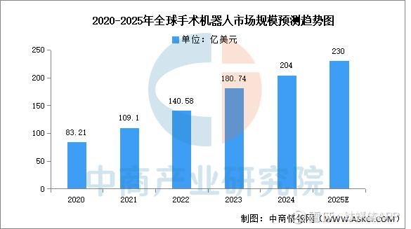 01 全球VS中国的手术机器人“角逐”中商产业研究院的报告显示,2023年全球手术机器人市场规模达到约180.74亿美元,2024年约为204亿美元,近五年年均复合增长率达23.75%。