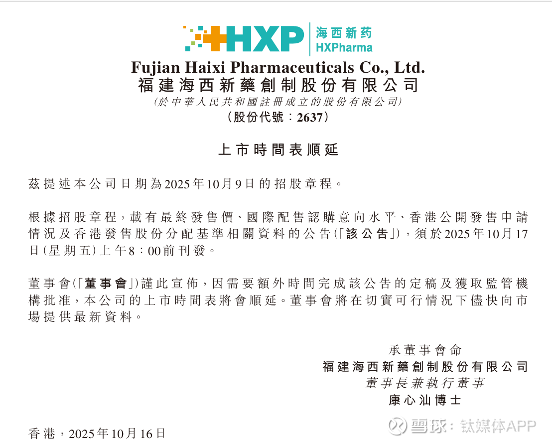 据了解,海西新药本应于10月17日敲钟,可就在即将上市的时候,该公司发布公告称,因需要额外时间完成配发结果公告的定稿及获取监管机构批准,公司的上市时间表将会顺延。
