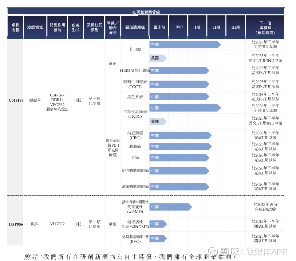 一是C019199,为一种靶向CSF-1R/DDR1/VEGFR2的创新多机制免疫调节剂。就该产品,海西新药预计2025年在中国启动骨肉瘤及乳腺癌的III期临床试验,并于取得FDA的IND批准后在美国启动单药或联合抗PD-1单克隆抗体治疗骨肉瘤及乳腺癌的I/II期临床试验。
