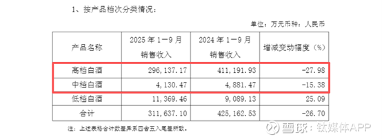 三季度经营数据显示,口子窖核心业务——高档白酒收入前三季度同比减少27.98%,是拖垮整体营收的核心因素。