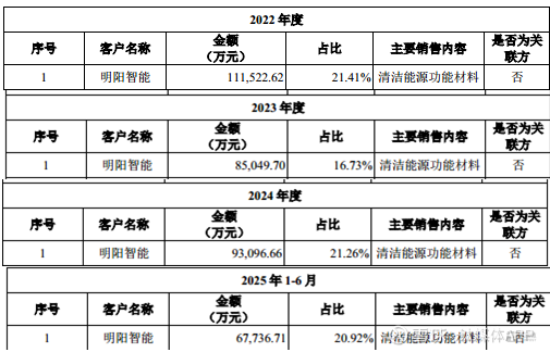 更值得关注的是业绩真实性问题,明阳智能作为振石股份报告期内的第一大客户,双方披露的交易数据存在较大差距。招股说明书显示,报告期内,振石股份向明阳智能产生的销售收入分别为111522.62万元、85049.7万元、93096.66万元、67736.71万元,明阳智能在始终位列在公司的第一大客户头衔。