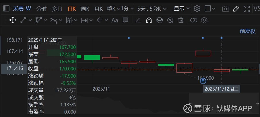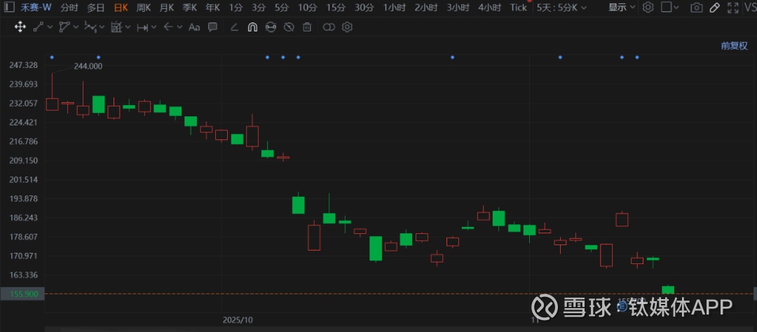 股价大跌背后的市场隐忧2025年9月,禾赛才刚在港交所挂牌上市,是一家名副其实的新股。其上市当日股价曾达到244港元的高位,这对于估值水平一向审慎的港股市场而言,其定价显得尤为突出。但上市后仅约两月,禾赛股价便从高点下跌了约1/3。