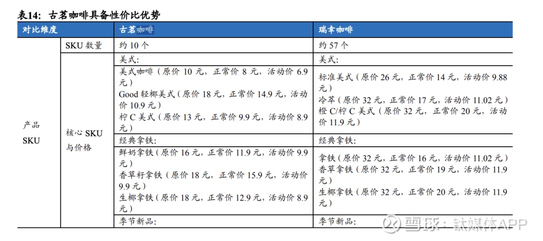 截至今年6月30日,古茗已经为8000家门店配备了咖啡机,并在6个月内上新了16款咖啡饮品。国泰海通的统计显示,瑞幸美式咖啡的正常价格和活动价格分别为14元和9.88元,古茗的美式咖啡正常价和活动价分别为8元和6.9元,瑞幸的拿铁正常价和活动价分别为16元和11.02元,而古茗鲜奶拿铁正常价和活动价则分别为11.9元和9.9元。