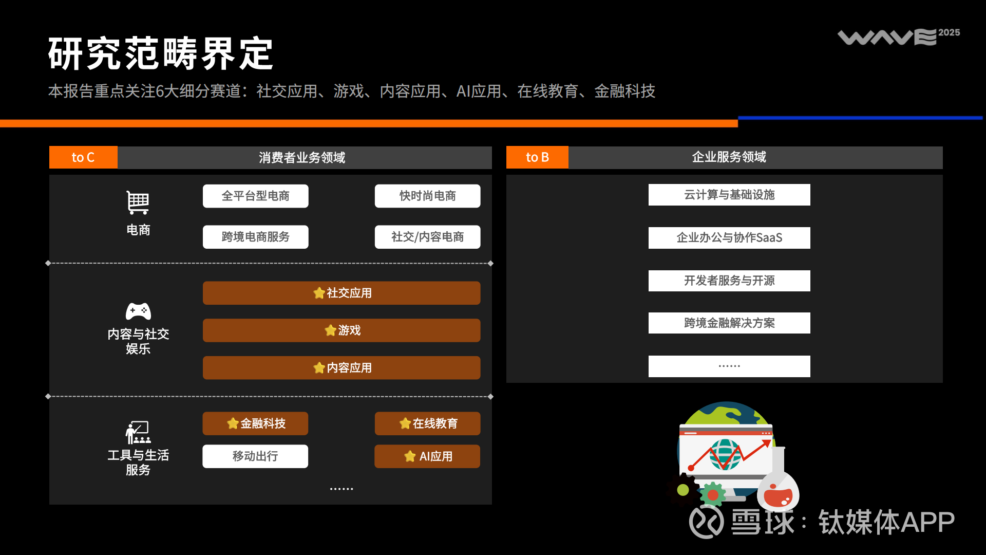 泛互联网本身是一个很大的概念,但我们这次报告探讨的范畴,主要聚焦在社交应用、游戏、内容应用、AI应用、在线教育、金融科技这六个主要的赛道。