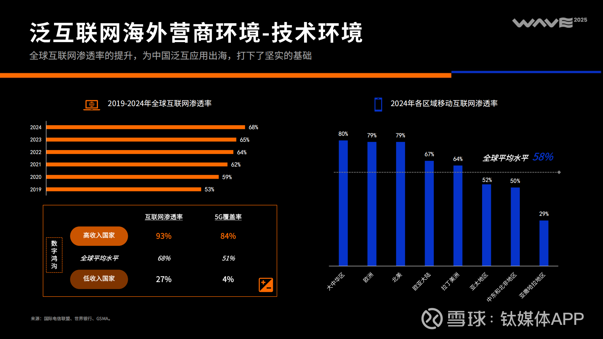 泛互联网出海的先决条件,是海外基础设施的不断完善。从技术环境看,2024年全球互联网渗透率达68%,5G网络覆盖率为51%,移动互联网渗透率为58%。全球互联网渗透率的提升,为中国泛互应用的出海,打下了坚实的基础。