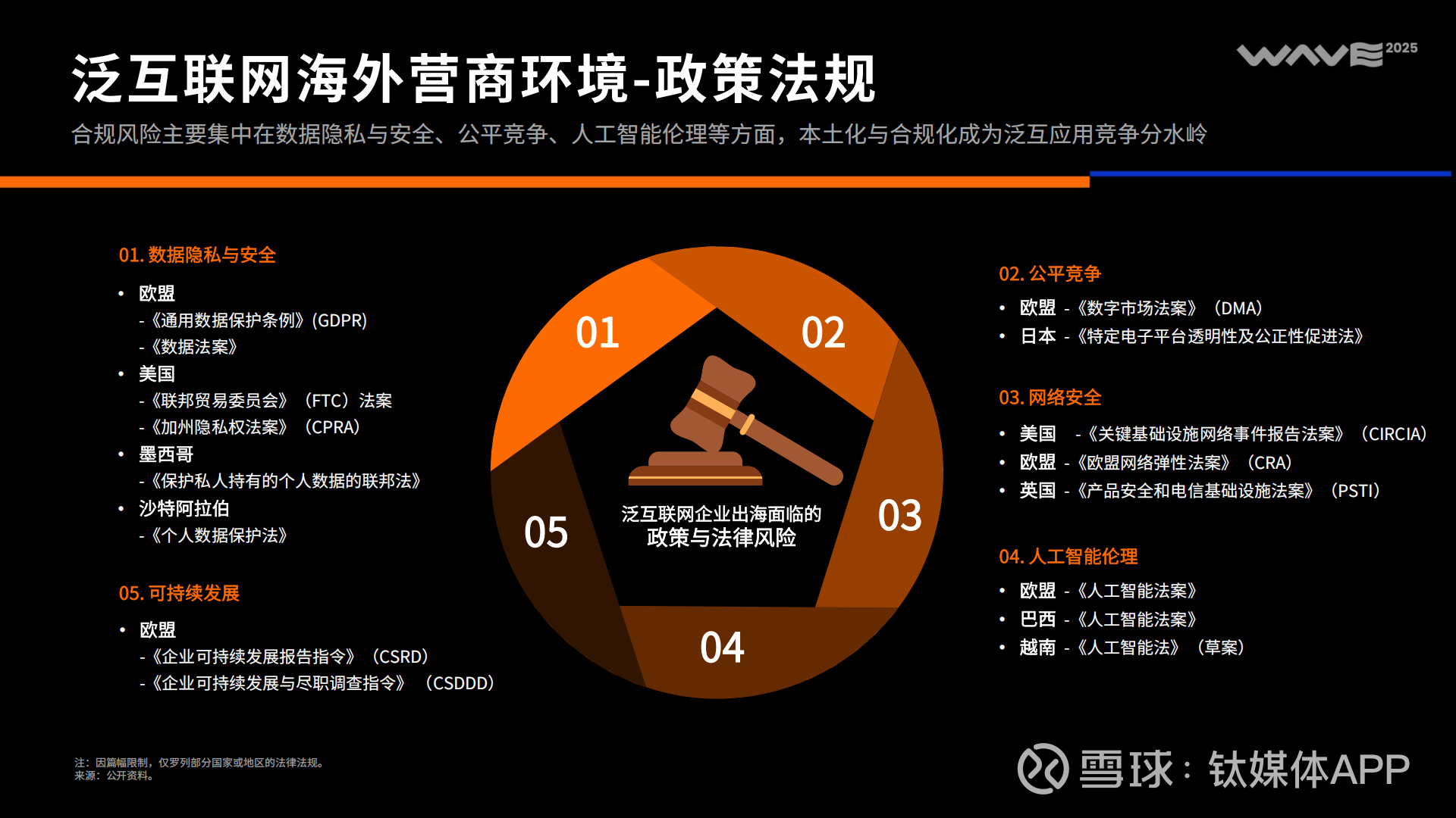 除此之外,海外的营商环境、政策法规也影响着泛互出海的进程。目前,虽然 “Copy from China” 的红利仍在释放,但是大家在海外竞争的焦点,已经转向本土合规与原创 IP 的沉淀了。像欧盟、北美、中东、东南亚等不同地区,都出台了涉及数据隐私与安全方面的法律法规。