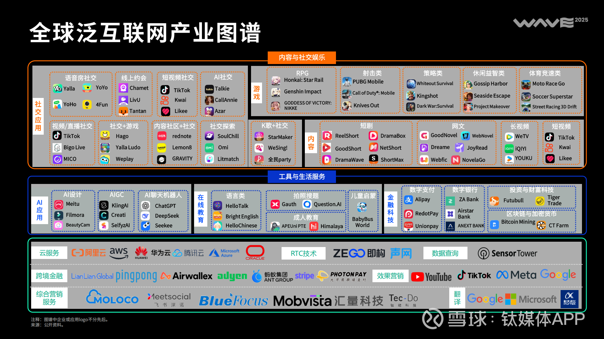 这张图呈现的就是,全球泛互联网产业图谱。从上游的内容与社交娱乐应用,到下游的技术服务、金融科技与数字营销服务,清晰展示了中国互联网企业出海的概况。